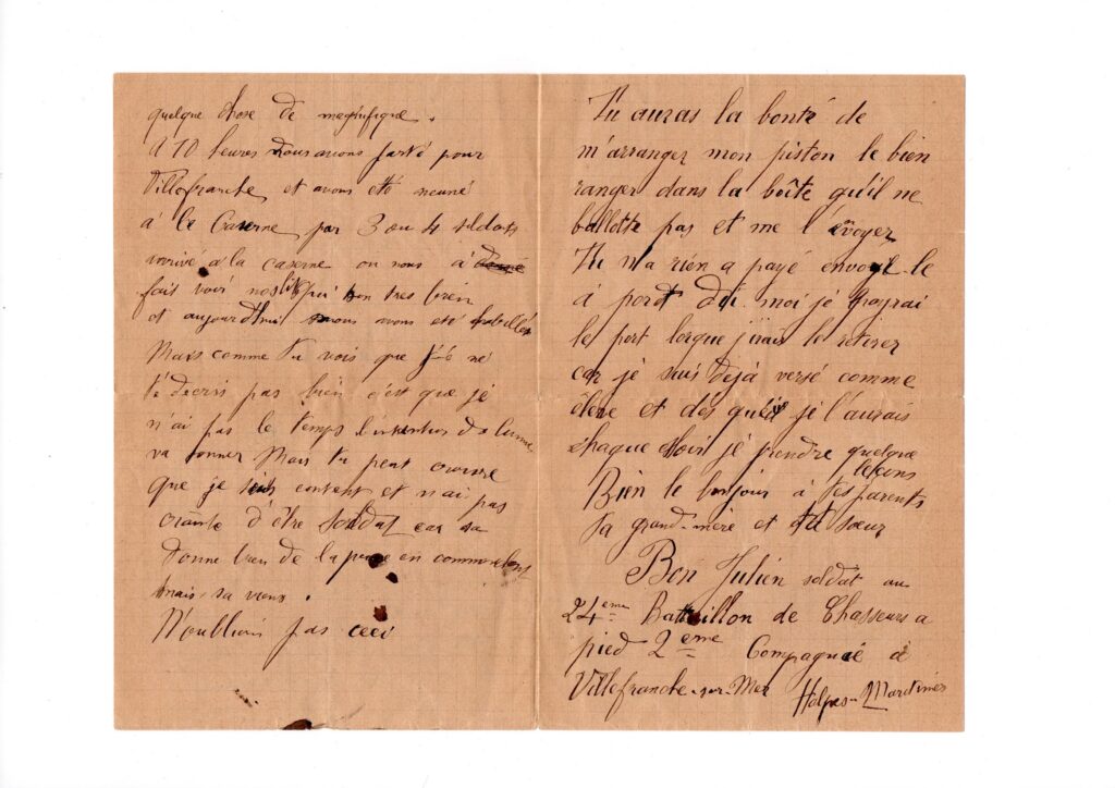 Il avait en sa possession, une lettre de mon arrière-grand-père Julien BON, datant du 17 novembre 1896. Il était parti faire son service militaire à Villefranche sur Mer et lui raconte son voyage et son arrivée à Nice et à Villefranche sur Mer. Et il lui demande de lui envoyer son clairon par la poste.